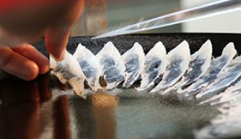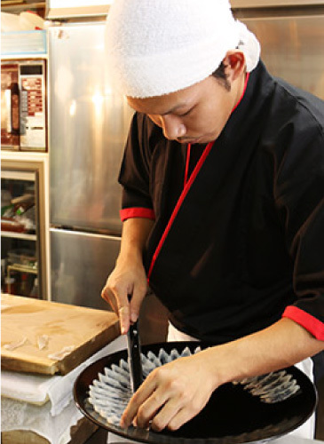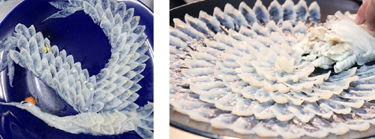 ふぐの身は弾力があり、なかなか噛み切ることができないため、薄く挽ける技術がふぐ料理人の必須条件。