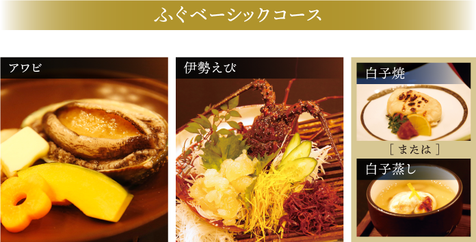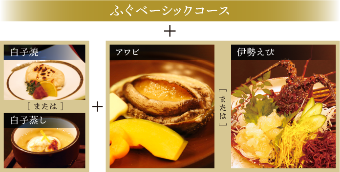 ※白子料理は12月〜になります。10・11月は焼フグになります。 ※アワビ又は伊勢えびの選択は2名様以上からとなります。